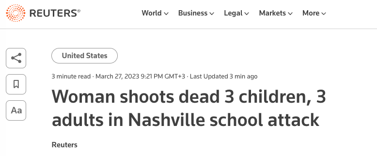 Количество погибших в результате стрельбы в приходской школе в Нэшвилле (США) увеличилось до шести человек. Также стало известно, что огонь открыла 28-летняя девушка, вооруженная двумя штурмовыми винтовками и пистолетом.