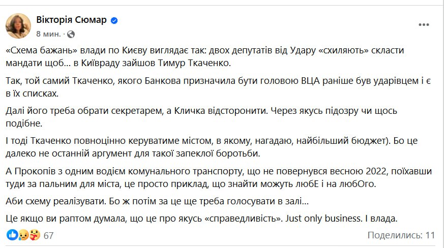 "Схема желаний" власти по Киеву выглядит так: двух депутатов от "Удара" "склоняют" сложить мандаты, чтобы в Киевсовет зашел Тимур Ткаченко. Да, тот самый Ткаченко, которого Банковая назначила быть председателем ГВА, ранее был "ударником" и есть в их списках (то есть в списках партии Кличко на выборах в Киевраду в 2020 году - Ред.). Дальше его нужно избрать секретарем, а Кличко отстранить. По какому-то подозрению или что-то в этом роде", - написала Сюмар.