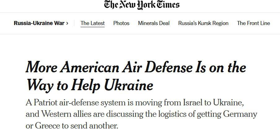 "Система ПВО Patriot, базировавшаяся в Израиле, будет передана Украине после ремонта, также западные союзники обсуждают организацию передачи еще одной со стороны Германии или Греции", - говорится в статье.