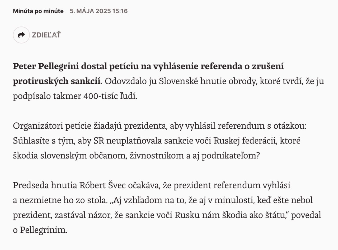 Президенту Петеру Пеллегрини предлагают объявить референдум с вопросом: "Согласны ли вы с тем, что Словацкая Республика не должна применять санкции против Российской Федерации, наносящие ущерб гражданам, торговцам и предпринимателям Словакии?"
