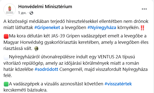 "Несмотря на слухи, Gripen были замечены в воздухе возле Ньиредьхазы не из-за беспилотников. Силы обороны Венгрии подняли в воздух два истребителя JAS-39 Gripen в рамках обучающей тревоги, которая в воздухе превратилась в боевую. Планер Ventus 2A вылетел из Ньиредьгазы по маршруту, но из-за погодных условий его отнесло близко к румынской границе, а затем он развернулся назад в сторону Ньиредьхазы", - заявили в Минобороны.