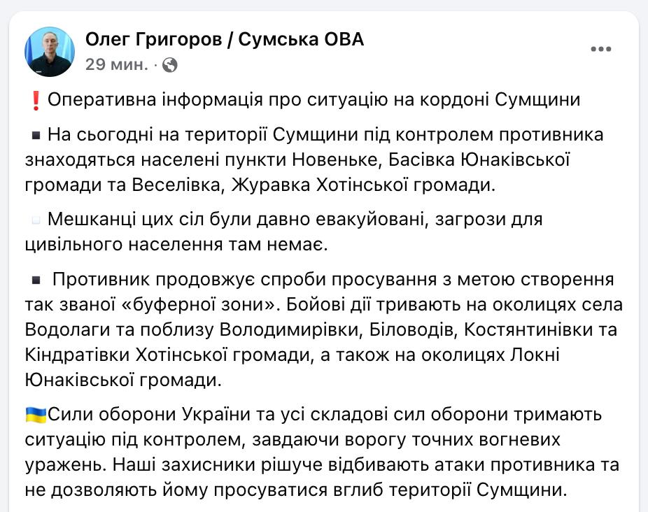 Также в Сумской ОВА подтвердили, что в окрестностях села Водолаги и вблизи Владимировки, Беловодов, Константиновки и Кондратовки Хотинской общины, а также в окрестностях Локни Юнаковской общины продолжаются бои.