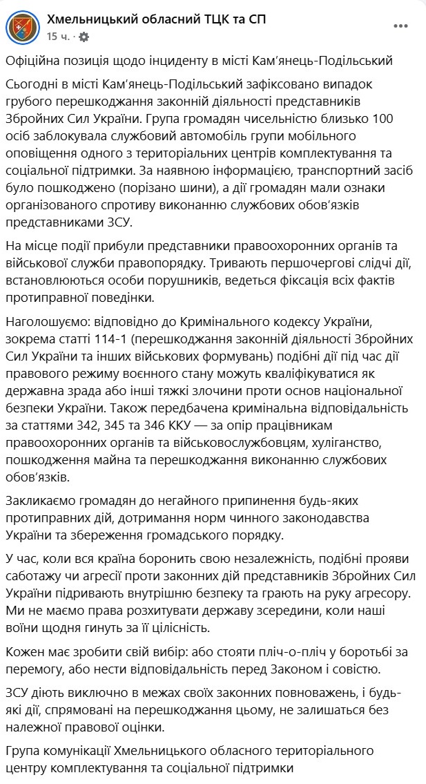 Хмельницкий областной ТЦК в официальном заявлении заявил о "грубом препятствовании законной деятельности ВСУ". По их словам, действия граждан носили организованный характер и могли квалифицироваться как сопротивление при исполнении служебных обязанностей. Проводится фиксация фактов и установление участников событий.