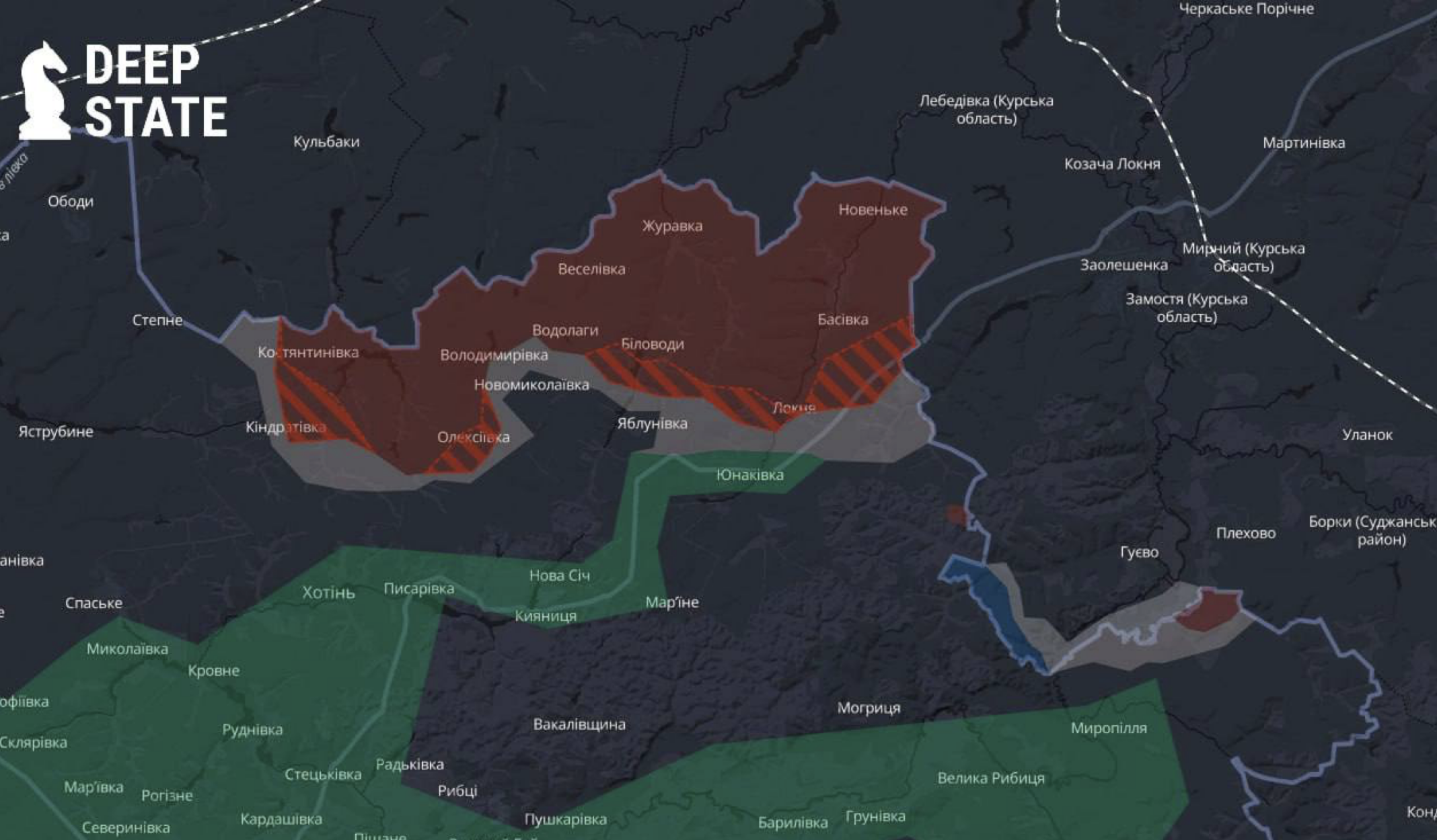 Сложная ситуация складывается и на участке Новониколаевка-Варачино-Яблоновка-Юнаковка, где российские военные пытаются занять населенные пункты и закрепиться, несмотря на значительные разрушения в Юнаковке. В районе Локни ВС РФ пытается продвигаться восточнее села в леса в направлении Садков, что создает серьезные сложности для его вытеснения.