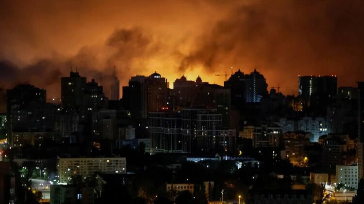 4.48 Киев подвергся ракетно-дроновой атаке. Над городом поднимается огромный столб дыма.