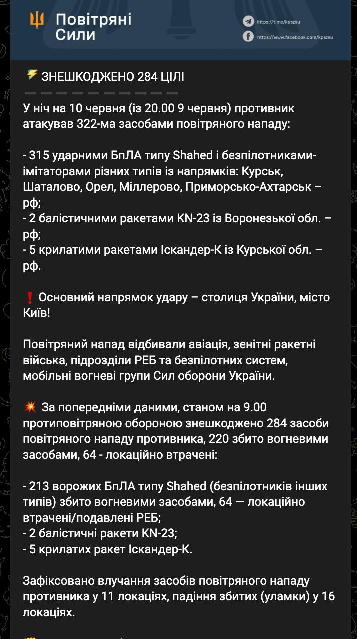 При этом сбито 213 из 322 "Шахедов", еще 64 подавлены РЭБ или упали в неизвестных локациях.