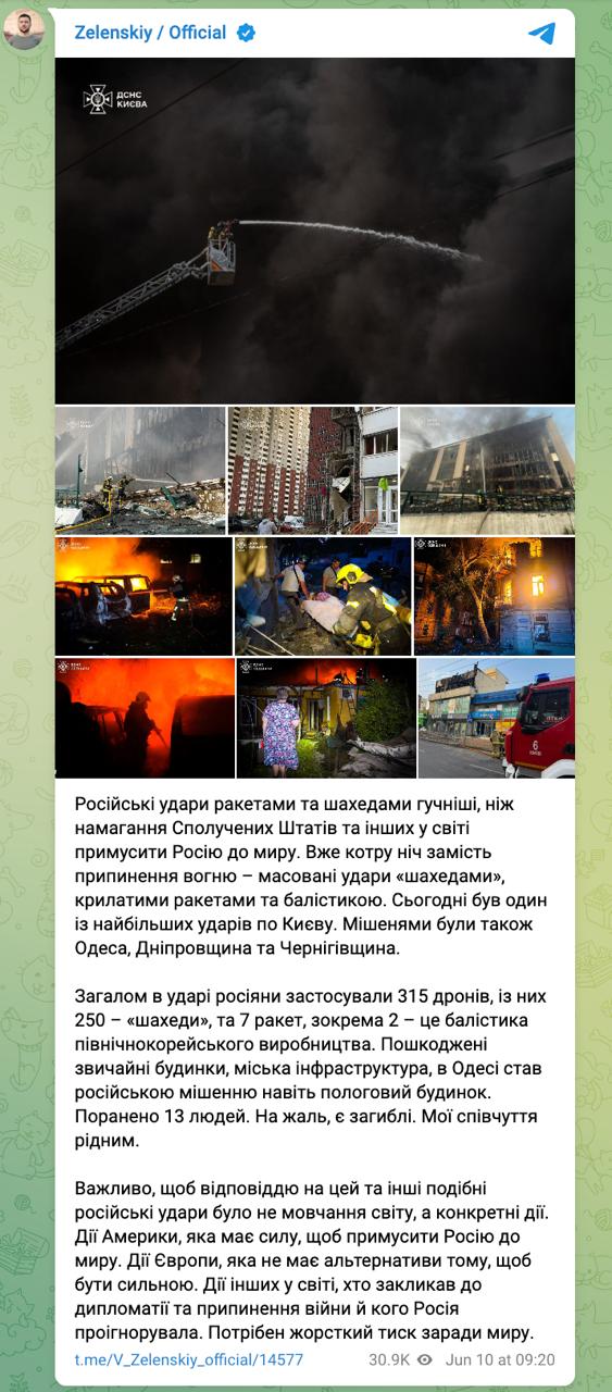 "Важно, чтобы ответом на этот и другие подобные российские удары было не молчание мира, а конкретные действия. Действия Америки, которая имеет силу, чтобы принудить Россию к миру. Действия Европы, которая не имеет альтернативы тому, чтобы быть сильной. Действия других в мире, кто призывал к дипломатии и прекращению войны и кого Россия проигнорировала. Нужно жесткое давление ради мира", - написал президент Украины.