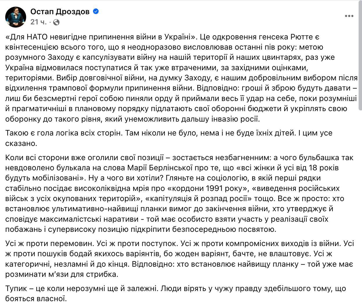 Об этом написал в Фейсбуке журналист Остап Дроздов, комментируя заявление генсека НАТО Марка Рютте, где тот дает понять, что странам Альянса невыгодно завершение конфликта.