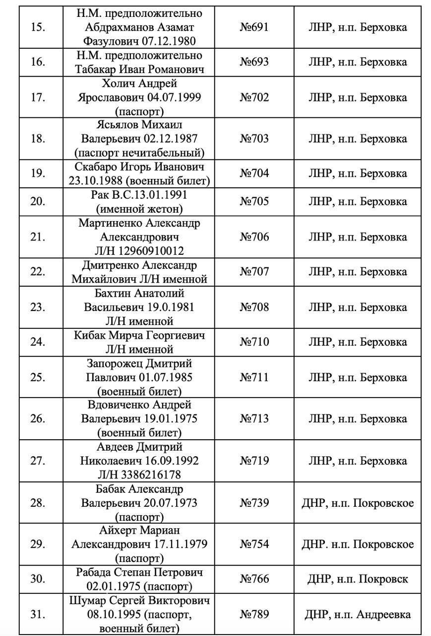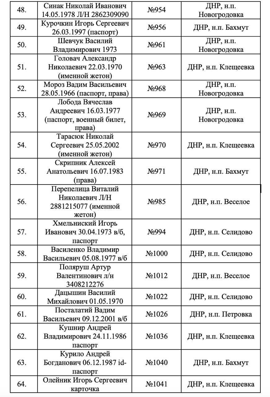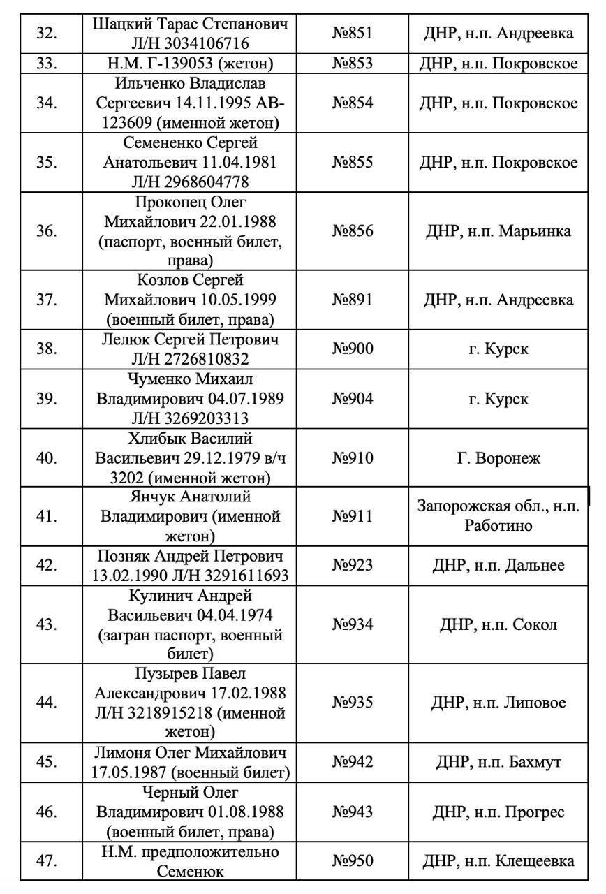 Чиновник выложил фамилии 121 военного, которые погибли, как следует из таблиц, на разных участках фронта от Курской до Донецкой области. Судя по всему, тела были собраны в разные периоды, поскольку в нем значатся погибшие в том числе из Авдеевки, где основные бои шли в 2023-2024 годах.