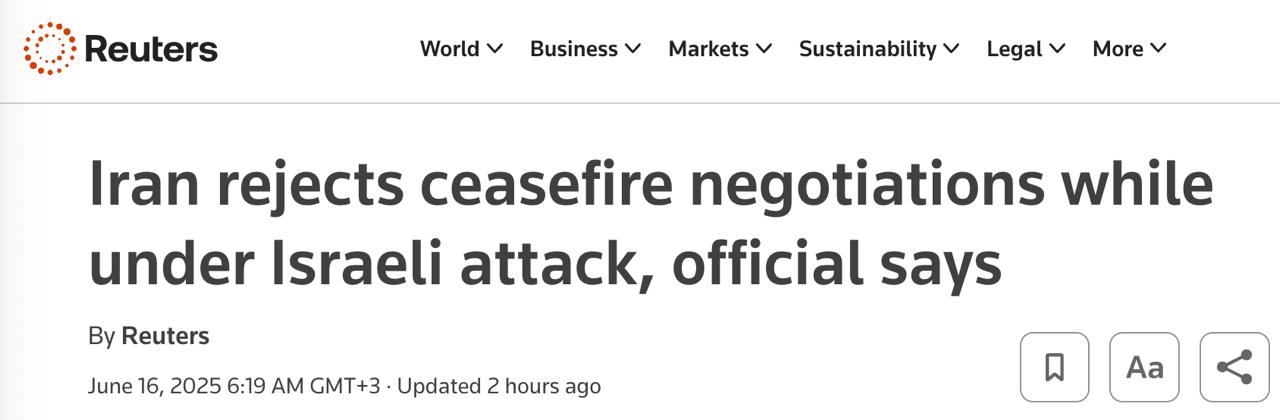 10.56 МИД Ирана официально заявил, что отказывается вести переговоры, пока Израиль продолжает наносить удары. Ранее о такой позиции Тегерана сообщали СМИ.