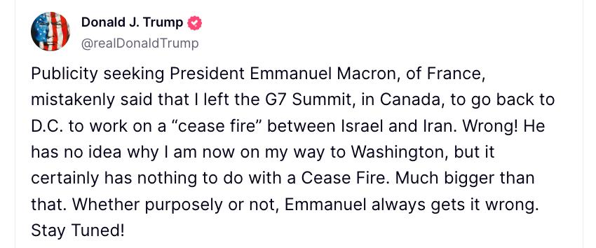 "Жаждущий публичности Макрон ошибочно заявил, что я покинул саммит G7 в Канаде, чтобы вернуться в Вашингтон и работать над "прекращением огня" между Израилем и Ираном. Неправда! Он понятия не имеет, почему я сейчас направляюсь в Вашингтон, но это уж точно не связано с прекращением огня. Это гораздо более серьёзно. Преднамеренно или нет - Эмманюэль всегда всё путает. Следите за новостями!" - написал Трамп.