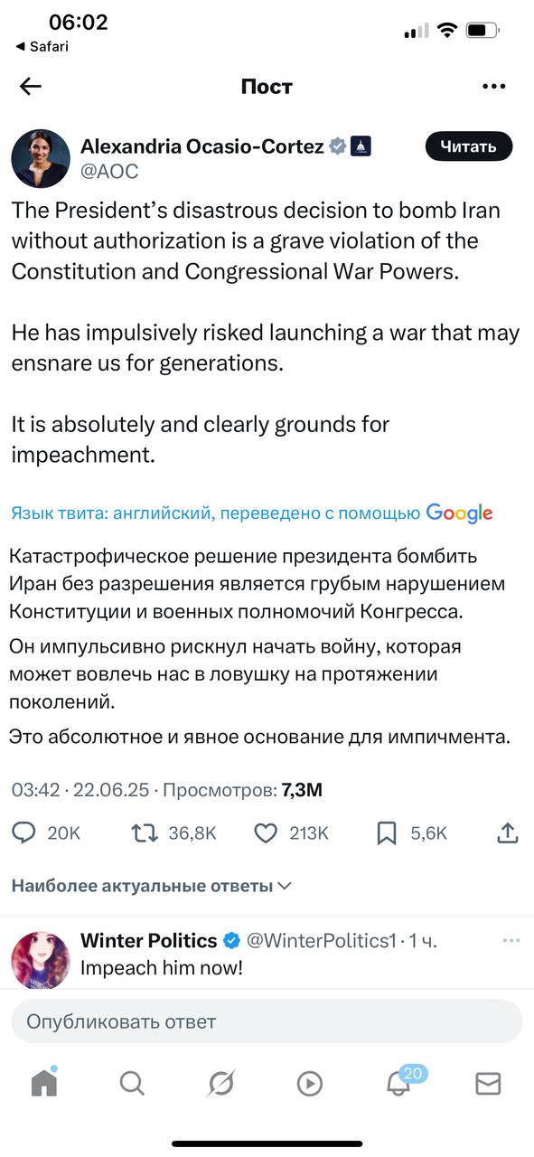 "Катастрофическое решение президента бомбить Иран без разрешения является грубым нарушением Конституции и военных полномочий Конгресса. Он импульсивно рискнул начать войну, которая может вовлечь нас в ловушку на протяжении поколений. Это абсолютное и явное основание для импичмента", - написала Окасио-Кортес на своей странице в Х.