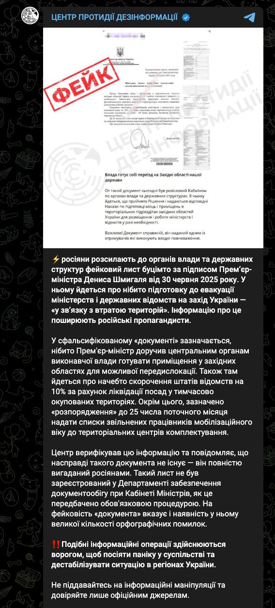 Однако в Центре противодействия дезинформации при СНБО Украины заявили, что документ фейковый. В ведомстве признали, что его действительно массово рассылают в украинские органы власти, но добавили, что это делают российские спецслужбы.