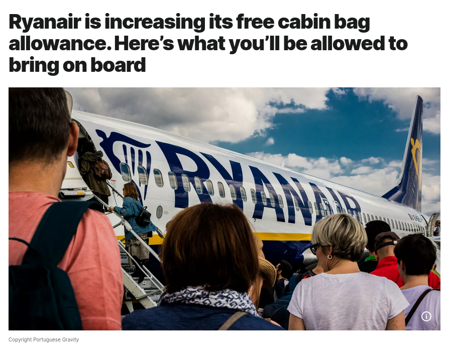 Ирландская бюджетная авиакомпания Ryanair уже в ближайшие недели увеличит допустимый размер бесплатной ручной клади – до габаритов 40×30×20 сантиметров.
