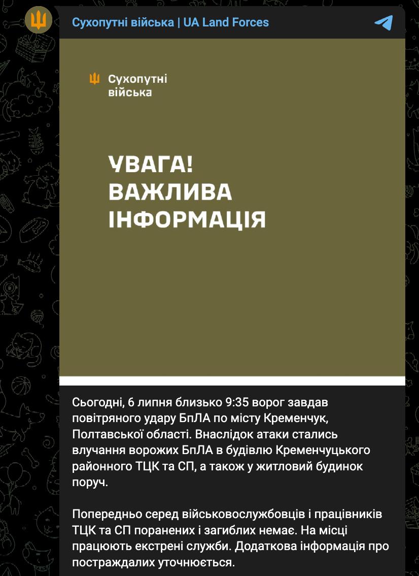 Сухопутные войска ВСУ подтвердили удар по районному военкомату в Кременчуге.