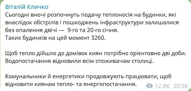 21:11 В Киеве без тепла остаются 3260 домов, им начнут восстанавливать теплоснабжение ночью, заявил мэр Кличко.