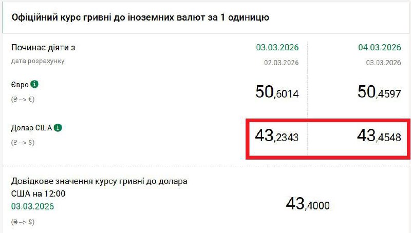 Регулятор підняв максимальний курс міжбанку до 43,6250 грн/$, а мінімальний становить 43,35 грн/$. Це вище за вчорашній 43,3 грн/$, а також показник 43,1 грн/$, який був перед початком війни в Ірані. А за підсумками безготівкових торгів НБУ підняв свій офіційний курс гривня/долар із вчорашніх 43,2343 грн/$до 43,4548 грн/$.