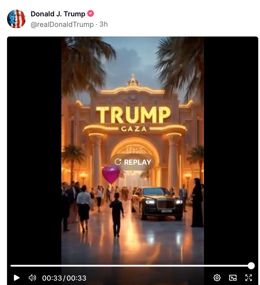 Готель Trump Gaza і Маск, що розкидає гроші. Трамп показав згенероване ШІ відео проекту перебудови Гази