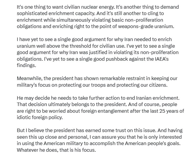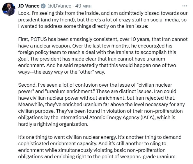 "Іран міг би мати мирну ядерну енергію без збагачення, але відмовився. Іран збагатив уран до рівнів, які значно перевищують ті, які необхідні для будь-яких цивільних цілей. Трамп може ухвалити рішення про вжиття додаткових заходів щодо припинення збагачення урану, і це рішення зрештою буде приймати він", - написав Венс.