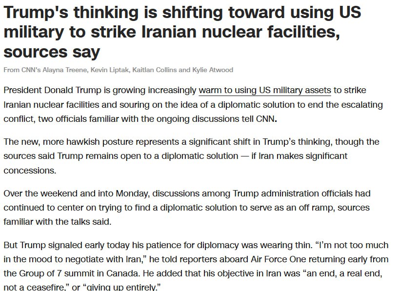 Американські офіційні особи заявили виданню, що Трамп серйозно розглядає можливість приєднання до війни та завдання удару США по ядерних об'єктах Ірану, особливо по підземному заводу зі збагачення урану у Фордо.