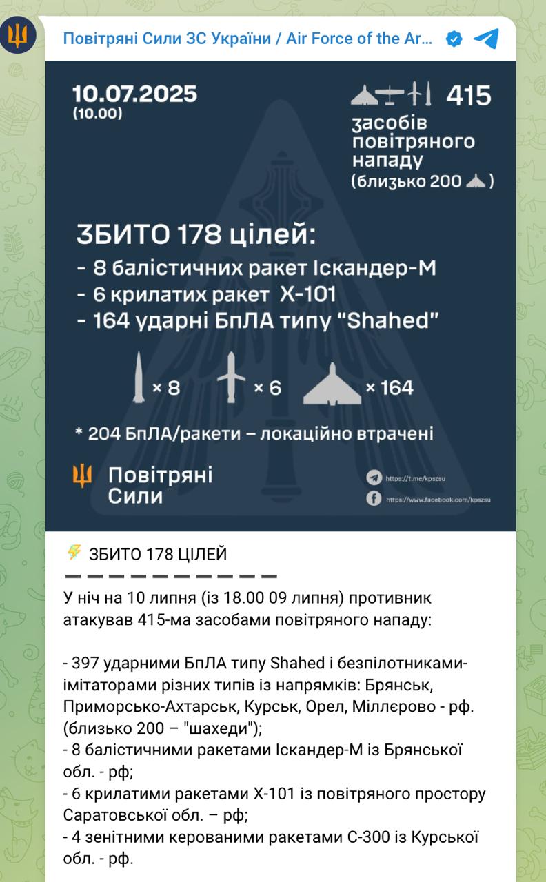 Ще 204 дронів і ракет були локаційно втрачені \придушені РЕБ.