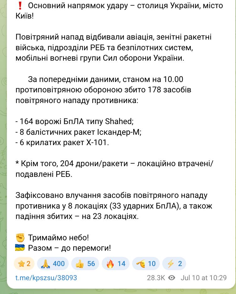 7.32 Росія цієї ночі завдала масованого удару по Києву та області із застосуванням дронів та ракет.