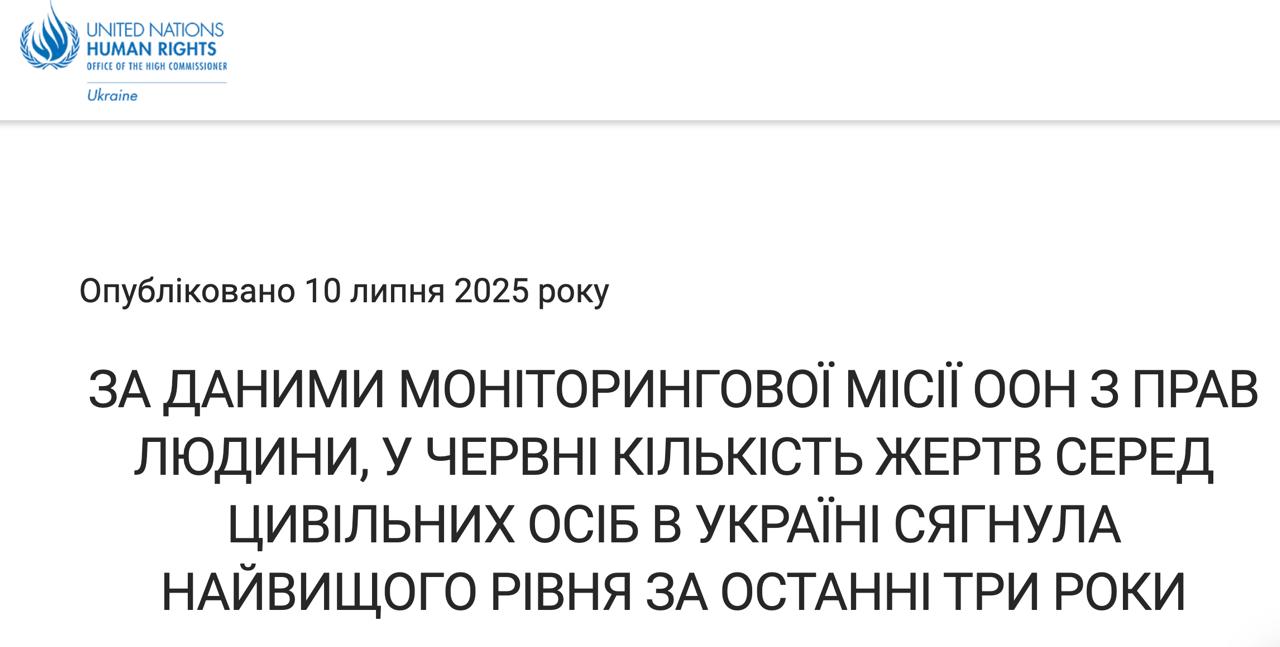 "Громадянське населення по всій Україні стикається з такими стражданнями, яких ми не бачили вже понад три роки", – заявила голова моніторингової місії ООН Даніель Белль. "Збільшення кількості ракетних ударів далекого радіусу дії та атак безпілотників принесло ще більше смертей та шкоди цивільному населенню у віддалених від лінії фронту районах".