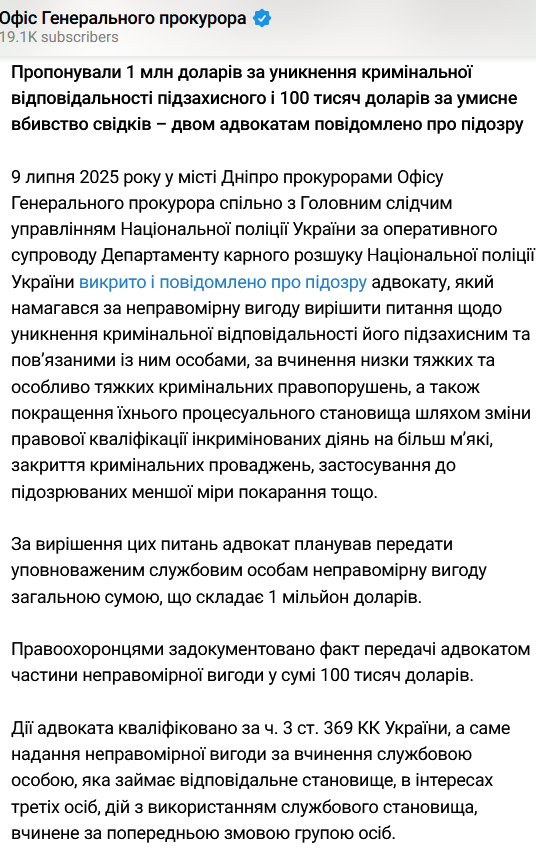 Про це повідомляє Офіс генерального прокурора у телеграм-каналі.