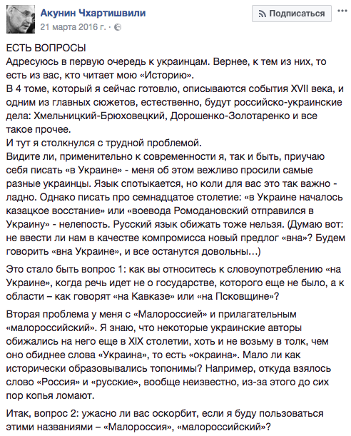 При этом, за термин "малороссийский" сам Акунин уже не раз просил прощения у украинцев. Вот что, например, он писал на этот счет на своей странице в Facebook весной прошлого года.