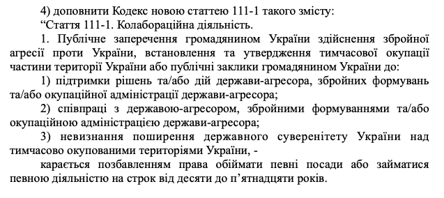 В Уголовном кодексе появляется новая статья 111-1 "Коллаборационная деятельность" (напомним, статья 111 - это государственная измена).