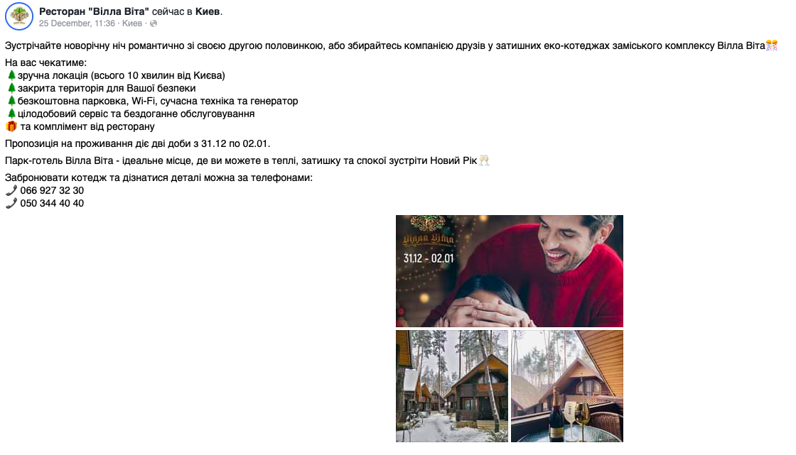 "Впервые за многие годы наш комплекс меняет традиции: мы отказались от новогодней ночи с шоу-программой, артистами и диско из-за военного положения в нашей стране. Для встречи 2023 года мы предлагаем двухэтажные коттеджи с каминами, на двоих или на компанию до 8 гостей", - сказала «Стране» управляющая «Вилла Вита».