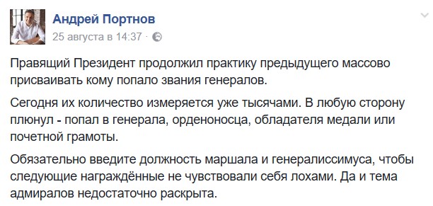"Правящий президент продолжил практику предыдущего массово присваивать кому попало звания генералов. Сегодня их количество измеряется уже тысячами. В любую сторону плюнул - попал в генерала, орденоносца, обладателя медали или почетной грамоты", - утверждает экс-замглавы АП Андрей Портнов.