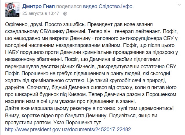 Еще один фигурант многочисленных публикаций СМИ, куратор главка "К" Службы безопасности Павел Демчина, которого оппоненты называют "смотрящим" в "конторе" от окружения Порошенко в лице нардепов Александра Грановского и Игоря Кононенко, также был повышен в звании. Первый заместитель главы СБУ стал генерал-лейтенантом.