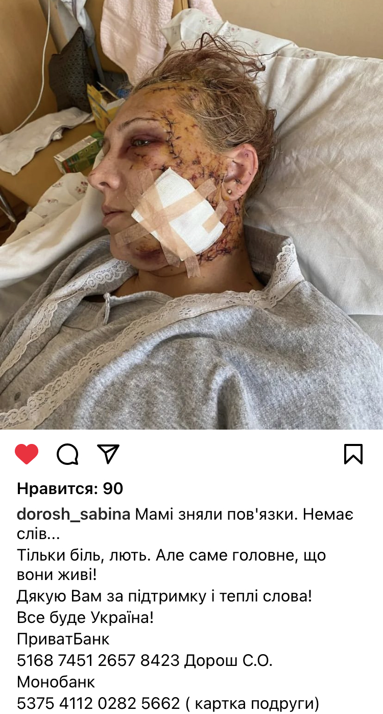 «Левая сторона лица у мамы полностью зашита, она не может до конца открывать рот - он у нее перекошен, сильная гематома под глазом, отек, осколочные раны - руки, голова, шея, ухо. У мамы сильно пострадало лицо. Она в сознании, говорит со мной, но она еще очень слаба», - сообщает Сабина.