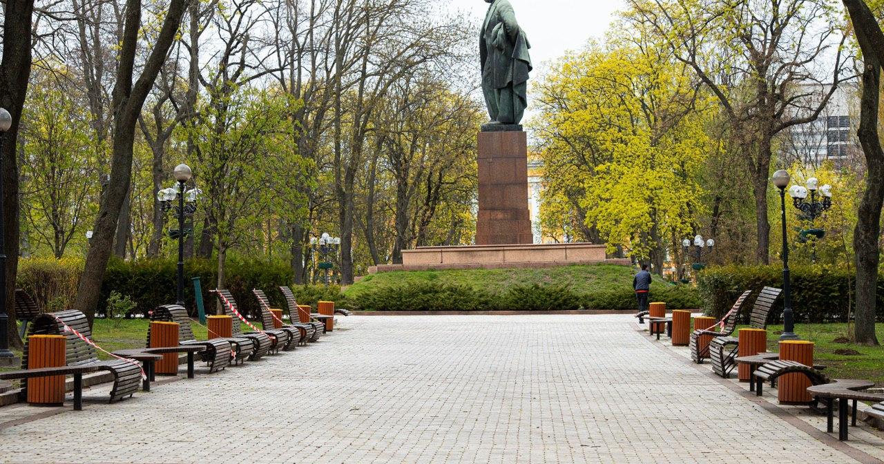 Традиционно мы заглянули в три основных парка в центре. Парк Вечной Славы, который находится неподалеку станции метро "Арсенальная" между Лаврской улицей и Днепровским спуском по прежнему закрыт. Территория обнесена барьерной лентой, людей в нем не наблюдается.