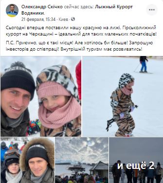 "Сегодня впервые поставили нашу красавицу на лыжи. Горнолыжный курорт на Черкащине - идеален для таких маленьких новичков. П.С. Приятно, что есть такие места! Но хотелось бы больше! Приглашаю инвесторов к сотрудничеству! Внутренний туризм должен развиваться", - написал Скичко у себя на странице в социальной сети Facebook, а "Страна" рассмотрела, что за куртку он надел для визита в Водяники.