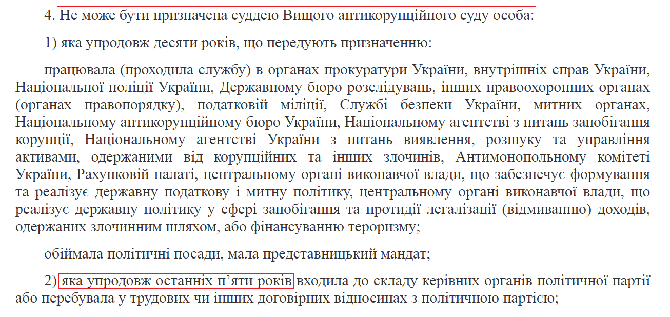Однако под сомнение может быть поставлена не только независимость, но и сам факт назначения Сергея Боднара судьей ВАКС. Дело в том, что согласно п.2 ч.4 статьи 7 Закона "О высшем антикоррупционном суде", не может быть назначено судьей ВАКС лицо, которое на протяжении последних пяти лет пребывало в договорных отношениях с политической партией:
