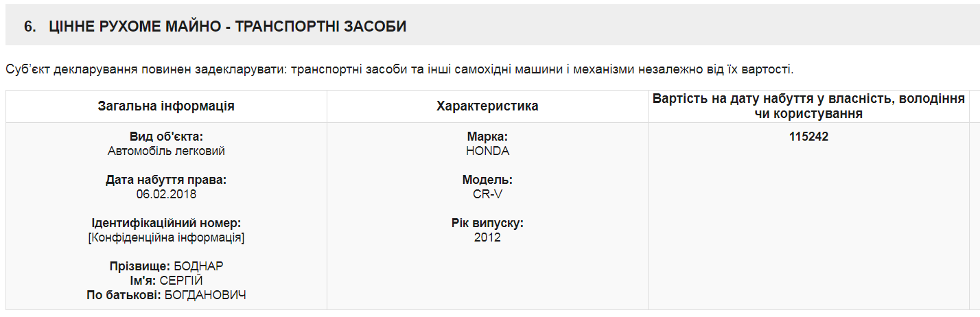 Еще один возможный "прокол" в декларациях Сергея Боднара – покупка ним машины по подозрительно низкой цене. В 2018 году он приобрел бэ-ушную "Хонду" CR-V, 2012 года выпуска, и задекларировал, что заплатил за нее всего 115,2 тыс грн. (эквивалент около 4,2 тыс дол). По рыночным ценам такое авто должно было стоить минимум вдвое дороже: