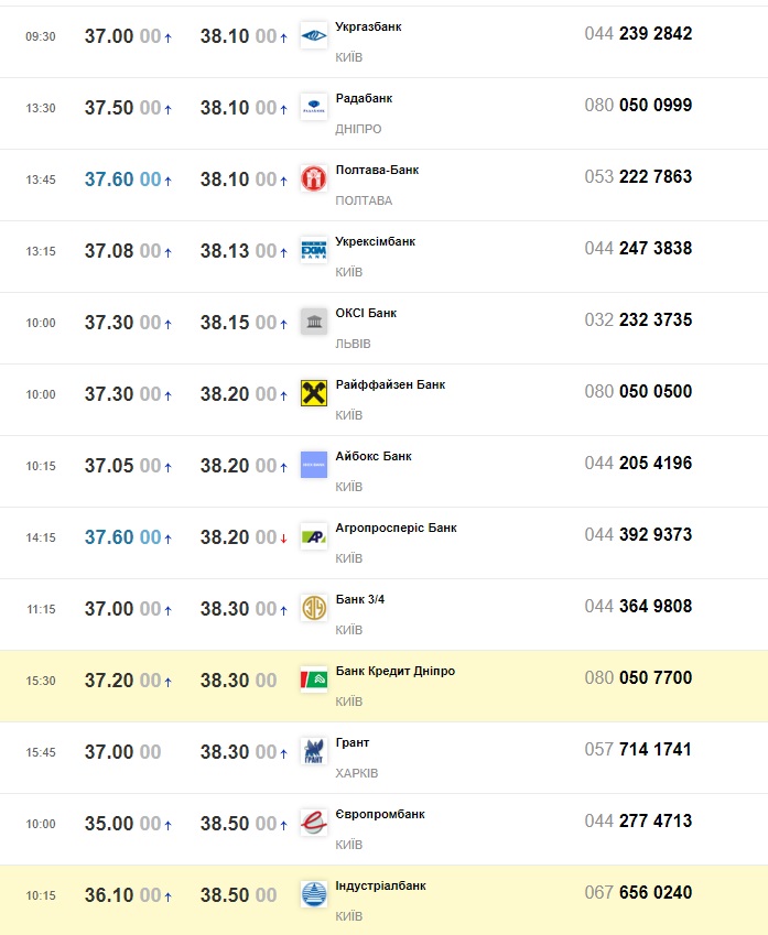 • 37,0-38,10 грн/€ — Укргазбанк;