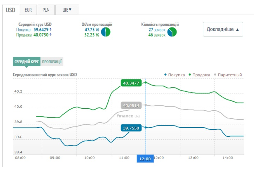 Об этом свидетельствуют средние данные, построенные на текущих сделках. После 10 часов курс продажи не опускался ниже психологического уровня 40 грн/$.