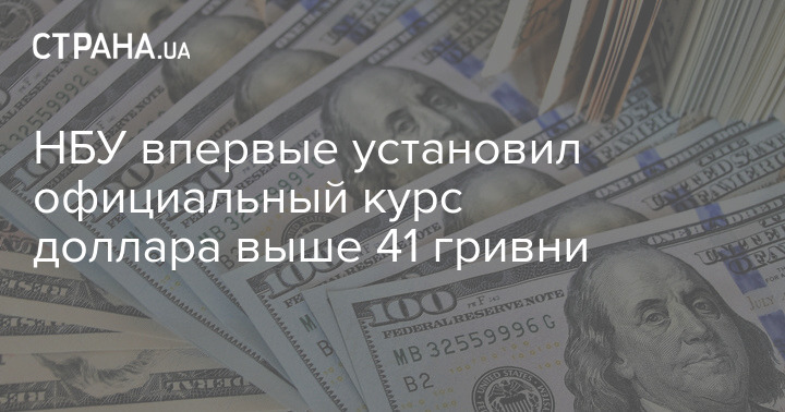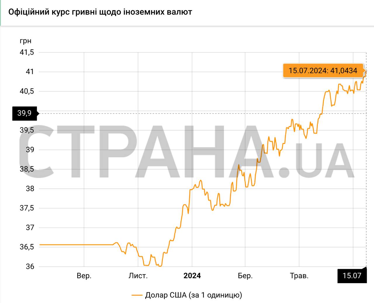 Национальный банк Украины впервые установил официальный курс доллара выше 41 гривни. На понедельник, 15 июля, он составит 41,0434.