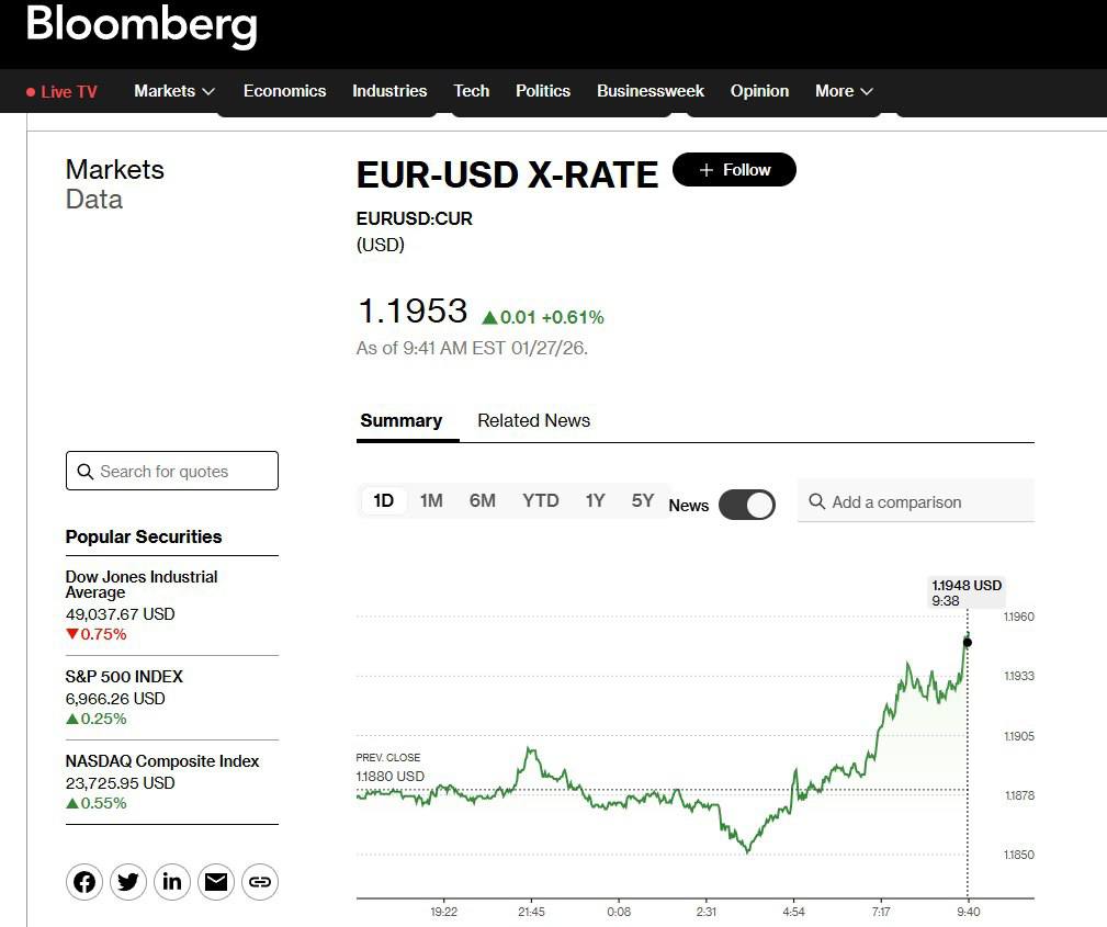 Причина в том, что курс евро резко растет на мировом рынке - доллар снижается. Сегодня эта пара вышла на новый исторический максимум в 1,1953, побив предыдущий - июня 2021 года в 1,193.