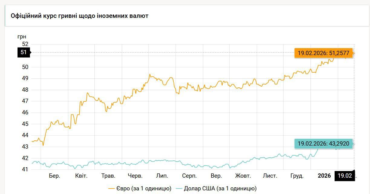 Национальный банк Украины дает активно расти курсу гривня/евро. В этой паре сегодня, 18 февраля, по официальному курсу НБУ был установлен новый исторический максимум на уровне 51,2577 грн/€.