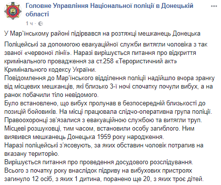 Сообщение в Марьинское отделения полиции поступило вчера утром от местных жителей. Около 3 ночи они услышали взрыв, а на утро увидели тело неизвестного.
