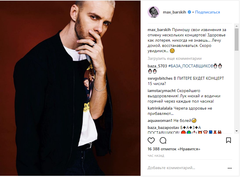 Украинский певец Макс Барских заболел и был вынужден отменить несколько концертов в России. Об этом артист сообщил в Instagram.