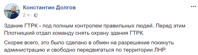 "Здание ГТРК - под полным контролем правильных людей. Перед этим Плотницкий отдал команду снять охрану здания ГТРК. Скорее всего, это было сделано в обмен на разрешение покинуть администрацию и свободно передвигаться по территории ЛНР", - написал Долгов около 17:00 сегодня, уточнив, что сам Плотницкий, по его информации, еще не пересекал границ Луганщины.