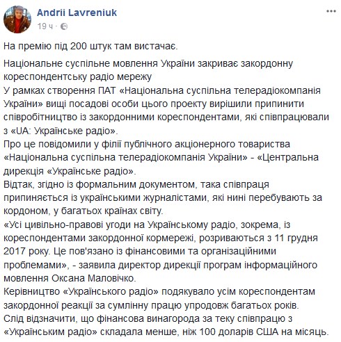 "В рамках создания ОАО "Национальная общественная телерадиокомпания Украины" высшие должностные лица этого проекта решили прекратить сотрудничество с зарубежными корреспондентами, которые сотрудничали с "UA: Украинский радио", - написал он.
