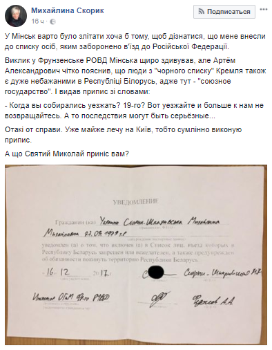 Скорик рассказала, что ей посоветовали больше не возвращаться в Беларусь. "Такие вот дела. Уже почти лечу в Киев, то есть добросовестно выполняю предписание", - написала она.