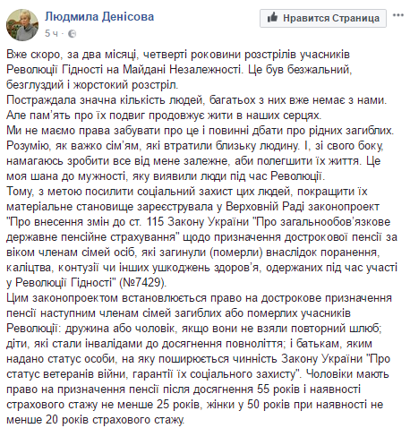 "С целью усилить социальную защиту этих людей, улучшить их материальное положение зарегистрировала в Верховной Раде законопроект “О внесении изменений в ст.115 Закона Украины "Об общеобязательном государственном пенсионном страховании” относительно назначения досрочной пенсии по возрасту членам семей лиц, погибших (умерших) вследствие ранения, увечья, контузии или иных повреждений здоровья, полученных во время участия в революции Достоинства (№7429)", - написала она.