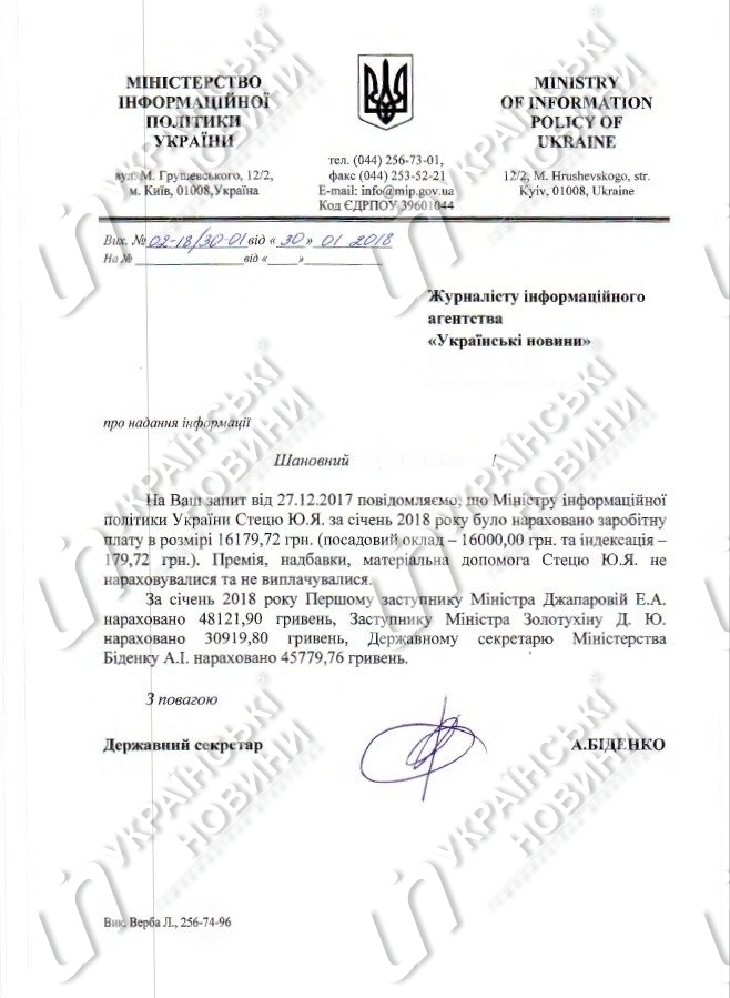 Зарплата первого заместителя министра информационной политики Эмине Джапаровой составила 48 121,9 гривен, заместителя Дмитрия Золотухина - 30 919,8 гривен, госсекретаря Артема Биденко - 45 779,76 гривны.